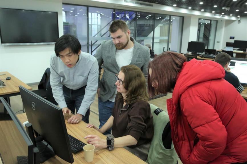 俄罗斯鲁班工坊第七期EPIP师资培训中,天津电子信息职业技术学院教师孙健(左一)与俄方教师进行云计算专题教学研讨。(图片由校方提供)